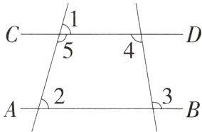 由同位角相等,两直线平行可知,当∠1 = ∠2时,AB//CD;由同旁内角互补,两直线平行可知,当∠2 + ∠5 = 180°时,AB//CD;由内错角相等,两直线平行可知,当∠4 = ∠3时,AB//CD;由三线八角可知,∠1与∠3既不是同位角也不是内错角,故由∠1 = ∠3不能判定AB//CD.故选D.