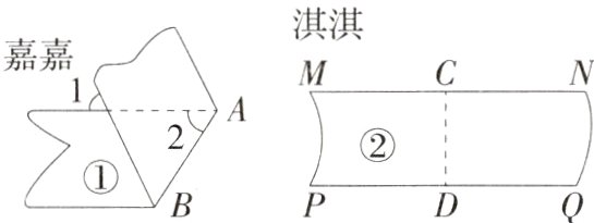 12. (2024 河北邢台威县三中月考)一次数学活动中,检验两条纸带①②的边线是否平行,嘉嘉和淇淇采用两种不同的方法:嘉嘉将纸带①沿$AB$折叠,量得$∠1 = ∠2 = 59°$;淇淇将纸带②沿$CD$折叠,发现$CN$与$CM$重合,$DQ$与$DP$重合(点$C$在$MN$上,点$D$在$PQ$上),如图所示,下列判断正确的是( )