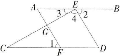 如图,$E$、$F$分别在$AB$和$CD$上,$∠1 = ∠D$,$∠2$与$∠C$互余,$AF⊥CE$于$G$。