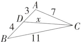 在△BCD中,由三角形的三边关系得11−4<x<11+4,即7<x<15,故7<x<10.故选B.