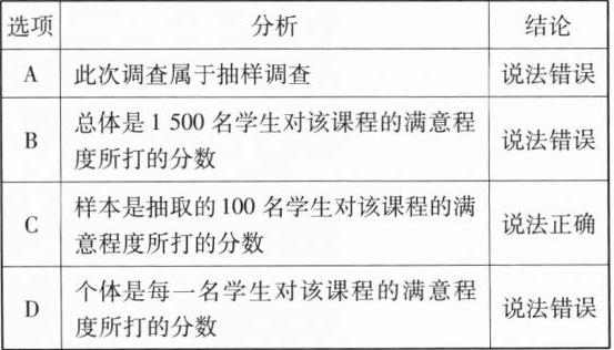 4 [新趋势·传统文化][2024衡水枣强二中月考]为弘扬中华优秀传统文化,倡导健康生活方式,某中学本学期开设了校本课程“八段锦”.为了解同学们对该课程的满意度,在全校的1 500名学生中随机抽取了100名学生对该课程的满意程度打分,下列说法正确的是( )