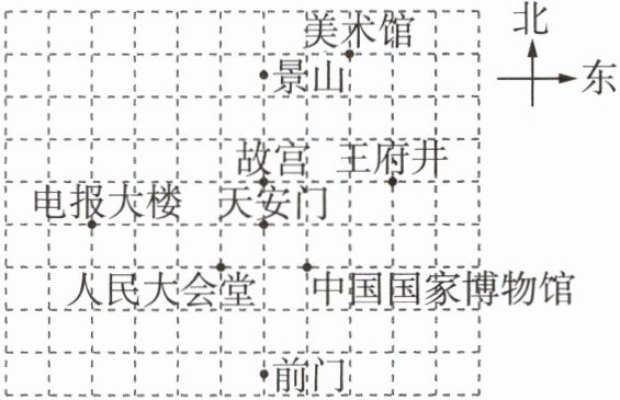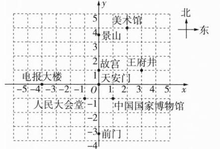 则天安门(0,0),故宫(0,1),景山(0,3.5),前门(0, - 3.5),电报大楼(-4,0),人民大会堂(-1, - 1),中国国家博物馆(1, - 1),王府井(3,1),美术馆(2,4). (注意:建立坐标系的方法不唯一,应以所求坐标容易表示为原则,所建立的坐标系不同,同一点的坐标也不同)