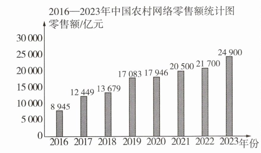 D 根据题图信息,可知2016年中国农村网络零售额最低,2023年中国农村网络零售额最高,2016—2023年,中国农村网络零售额持续增加,故A,B,C正确;从2021年开始,中国农村网络零售额突破20 000亿元,D错误。