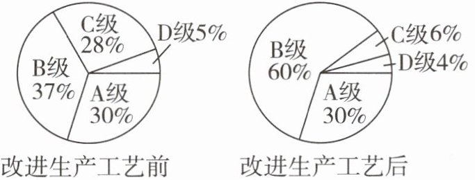 C 设原生产总量为1,则改进后生产总量为2,所以原A,B,C,D等级的生产量分别为0.3,0.37,0.28,0.05,改进后四个等级的生产量分别为0.6,1.2,0.12,0.08,所以改进生产工艺后,A级产品的数量增加,D级产品的数量增加,C级产品的数量减少,B级产品的数量增加了超过一倍。