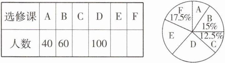 C 由题意可知,被调查的学生人数为$60\div15\% = 400$,所以选项A结论正确;因为$\frac{100}{400}\times360^{\circ} = 90^{\circ}$,$\frac{40}{400}\times360^{\circ} = 36^{\circ}$,$360^{\circ}\times(17.5\% + 15\% + 12.5\%) = 162^{\circ}$,所以扇形统计图中E部分扇形的圆心角度数为$360^{\circ} - 162^{\circ} - 90^{\circ} - 36^{\circ} = 72^{\circ}$,所以选项D结论正确;因为$400\times\frac{72^{\circ}}{360^{\circ}} = 80$,$400\times17.5\% = 70$,所以本次被调查的学生中最喜欢选修课E,F的人数分别为80,70,所以选项B结论正确;因为$\frac{40}{400}\times100\% = 10\%$,$12.5\%>10\%$,所以最喜欢选修课A的人数最少,所以选项C结论错误。