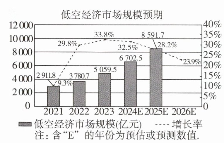 B 根据题图中的信息可知,2021至2026年中国低空经济市场规模逐年上升,故A说法正确;2023年中国低空经济市场规模增长率最高,2026年中国低空经济市场规模增量最多,故B说法错误;从2024年开始中国低空经济市场规模增长率变小,故C说法正确;8591.7×(1+23.9%)≈10645(亿元),即2026年中国低空经济市场规模将突破万亿元,故D说法正确.
