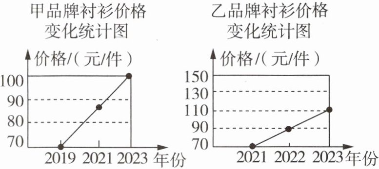 解:由题图知,2021 ~ 2023 年这 3 年间,乙品牌衬衫价格从 70 元/件增长到 110 元/件,而甲品牌衬衫在 2019 ~ 2023 年这 5 年间,其价格从 70 元/件增长到 100 元/件,所以乙品牌衬衫的价格增长较快,这与统计图给人的感觉不一致. 因为本题中仅两个统计图相比,甲的横轴(年份)被“压缩了”,而纵轴(价格)被“放大了”,所以从统计图直观上看甲品牌衬衫的价格增长较快.