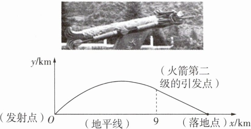 10 [新情境][2024武汉中考]16世纪中叶,我国发明了一种新式火箭“火龙出水”,它是二级火箭的始祖. 火箭第一级运行路径形如抛物线,当火箭运行一定水平距离时,自动引发火箭第二级,火箭第二级沿直线运行. 某科技小组运用信息技术模拟火箭运行过程. 如图,以发射点为原点,地平线为x轴,垂直于地面的直线为y轴,建立平面直角坐标系,分别得到抛物线y = ax² + x和直线y = -$\frac{1}{2}$x + b. 其中,当火箭运行的距离距离为9 km时,自动引发火箭的第二级.