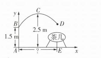 A@@如图,以$AE$所在直线为$x$轴、$AB$所在直线为$y$轴建立平面直角坐标系。 - **优解**:$\because AB = DE = 1.5\ m$,$\therefore$点$B$与点$D$关于对称轴对称,$\therefore AE = 2\times1.6 = 3.2(m)$。 - **通解**:由题意知,抛物线的顶点$C$的坐标为$(1.6,2.5)$,设抛物线的表达式为$y = a(x - 1.6)^{2}+2.5$,将点$B(0,1.5)$代入得,$2.56a + 2.5 = 1.5$,解得$a = -\frac{1}{2.56}$,$\therefore$抛物线的表达式为$y = -\frac{1}{2.56}(x - 1.6)^{2}+2.5$。当$y = 1.5$时,$-\frac{1}{2.56}(x - 1.6)^{2}+2.5 = 1.5$,解得$x = 0$(舍去)或$x = 3.2$,$\therefore$茶几到灯柱的距离$AE$为$3.2\ m$。