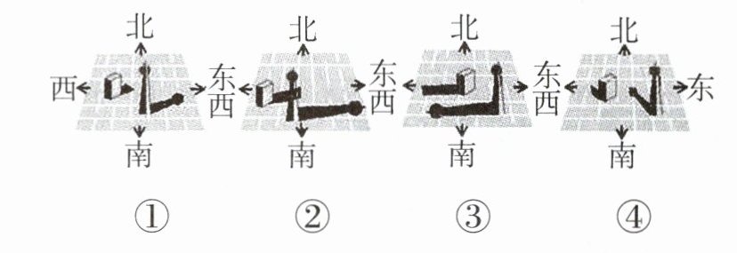 C@@由于太阳从东边升起,西边落下,所以影子的方向为西—西北—北—东北—东,所以影子的变化顺序为③④①②。