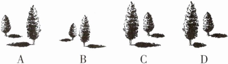 C@@同一时刻太阳光下树的影子是平行的,影子方向相同,且影长与树高成正比。选项A,B中的两棵树的影子方向都相反,故可排除;选项D中影长和树高不成正比,故可排除。