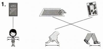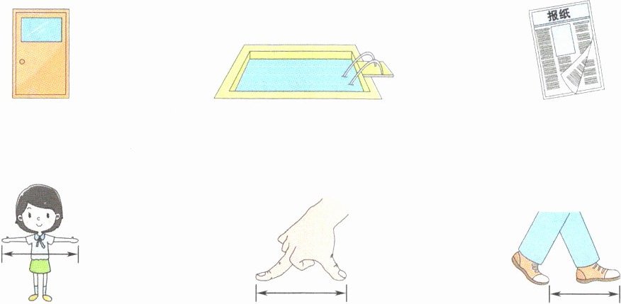 1.(生活运用)你选择用身体的哪个部位来测量门的宽度、游泳池的长度和报纸的长度?(连一连)