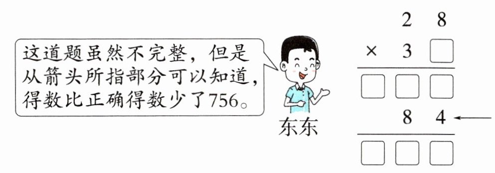 同意东东的说法 示例:因为箭头所指部分的末位应该与十位对齐,表示84个十,即840。而竖式中箭头所指的部分的末位与个位对齐,表示84个一,即84,相差$840 - 84 = 756$