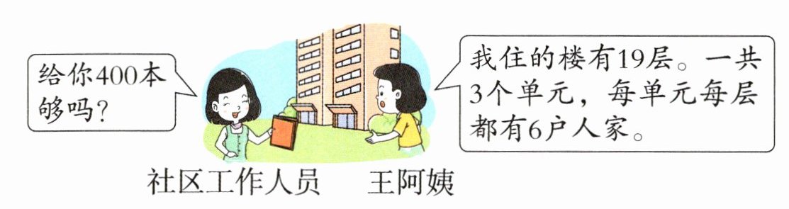 3. 为提高安全意识,社区要给居民发放一本安全宣传手册。王阿姨是社区服务志愿者,负责把安全宣传手册发放到同楼的每一户中。