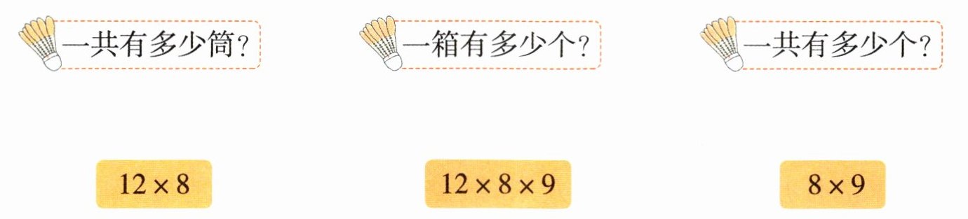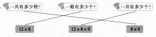 2. 商店运来9箱羽毛球,每箱8筒,每筒12个。把问题和对应的算式用线连起来。