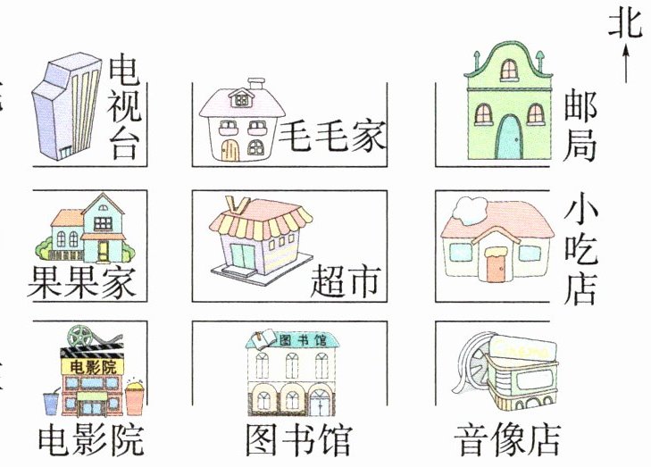 (2)毛毛家的南面有( )和( );小吃店在毛毛家的( )方向。