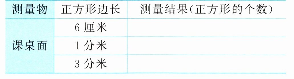 1. 已知一张桌子桌面的长和宽,选定一种正方形纸片作单位,测量这个桌面的面积。下面是贝贝、毛毛和飞飞三名同学的做法,请把他们的测量结果填在下表中。