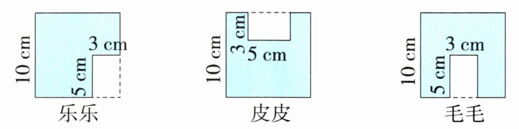 4. 在一张边长是10厘米的正方形纸上,剪去一个长5厘米、宽3厘米的长方形。乐乐、皮皮和毛毛剪的方式分别如下图所示。