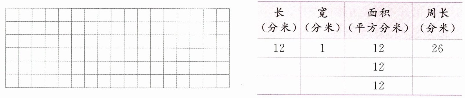 在方格纸上,先画出3个不同的长方形,要求面积都是12平方分米,再把表格补充完整。(每个□表示1平方分米)