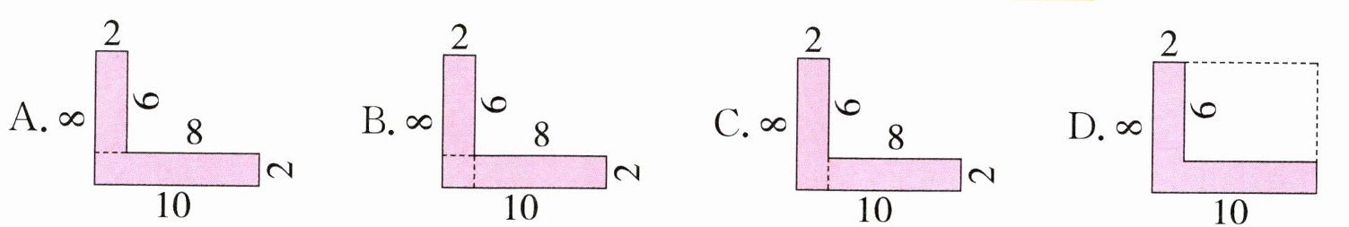 5. 元元和3个小伙伴正在计算一个花圃的面积,他们的想法各不相同。下图中( )种画法可以用算式“8×2×2”表示。(单位:厘米)