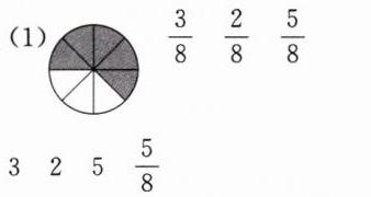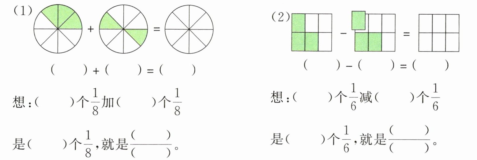 $\frac{5}{( )}-\frac{1}{( )}=\frac{4}{( )}$ $\frac{( )}{10}+\frac{( )}{10}+\frac{( )}{10}=\frac{8}{10}$