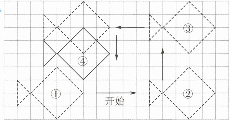 小鱼由①先向( )平移( )个方格到②,再向上平移5个方格到( ),然后向( )平移( )个方格,最后向( )平移( )个方格到④。