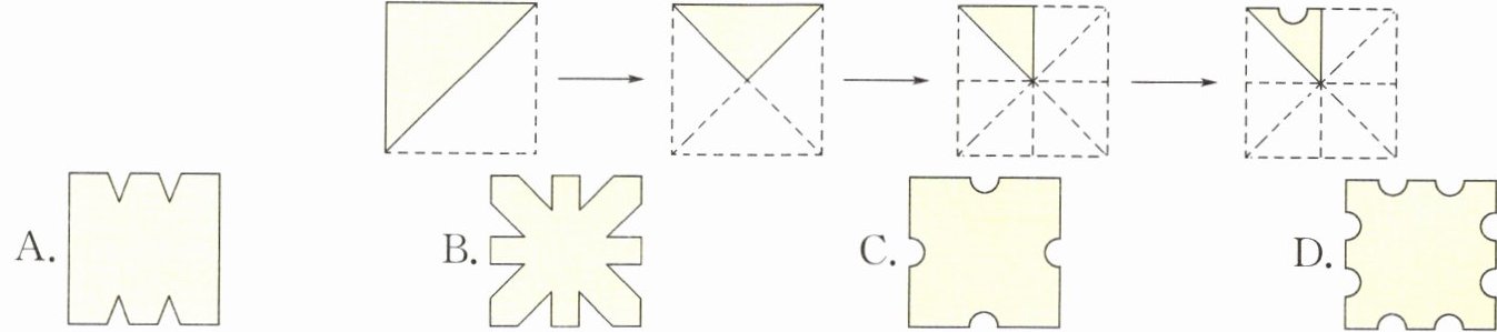 1. 如图,把一张正方形纸连续对折三次,剪一剪,展开后是下面的图( )。
