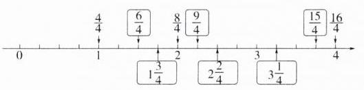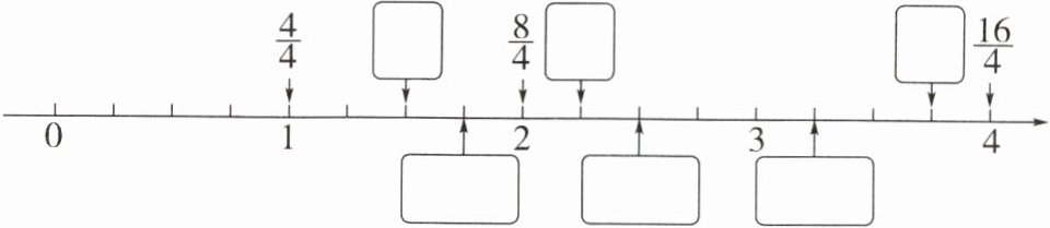 1.(数形结合)在直线上面的$\square$里填上合适的假分数,在下面的$\square$里填上合适的带分数。