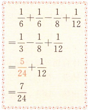 4. (新题型)乐乐买了一本《三国演义》,第一天看了全书的$\frac{1}{6}$,第一天比第二天多看了全书的$\frac{1}{8}$,第三天看了全书的$\frac{1}{12}$。如图所示是求他三天共看了这本书的几分之几的过程,算式中的“$\frac{5}{24}$”表示的是( )。