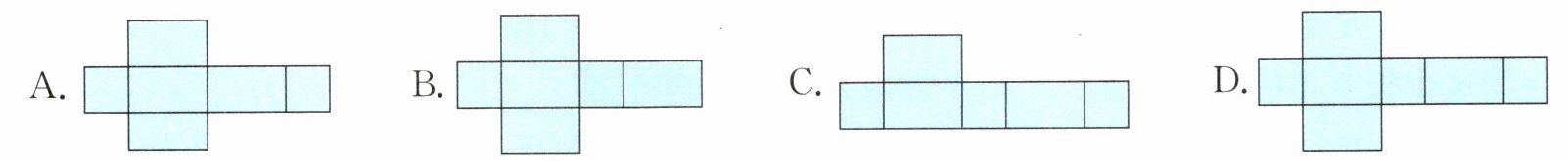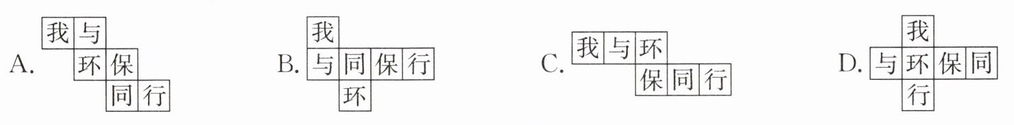 (2)(空间观念)在6月5日世界环境日这天,幸福社区为居民制作了一些纪念品,纪念品的包装盒如图所示,六个面分别写着“我”“与”“环”“保”“同”“行”6个字,“我”的对面是“环”,“同”的对面是“行”,则它的平面展开图可能是( )。