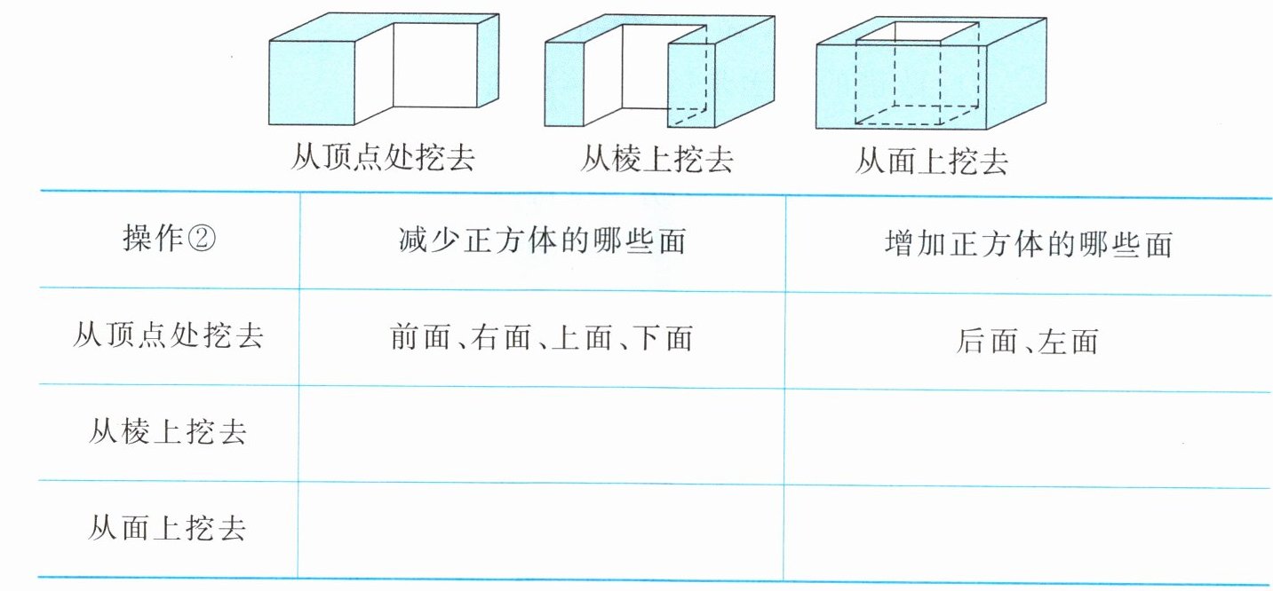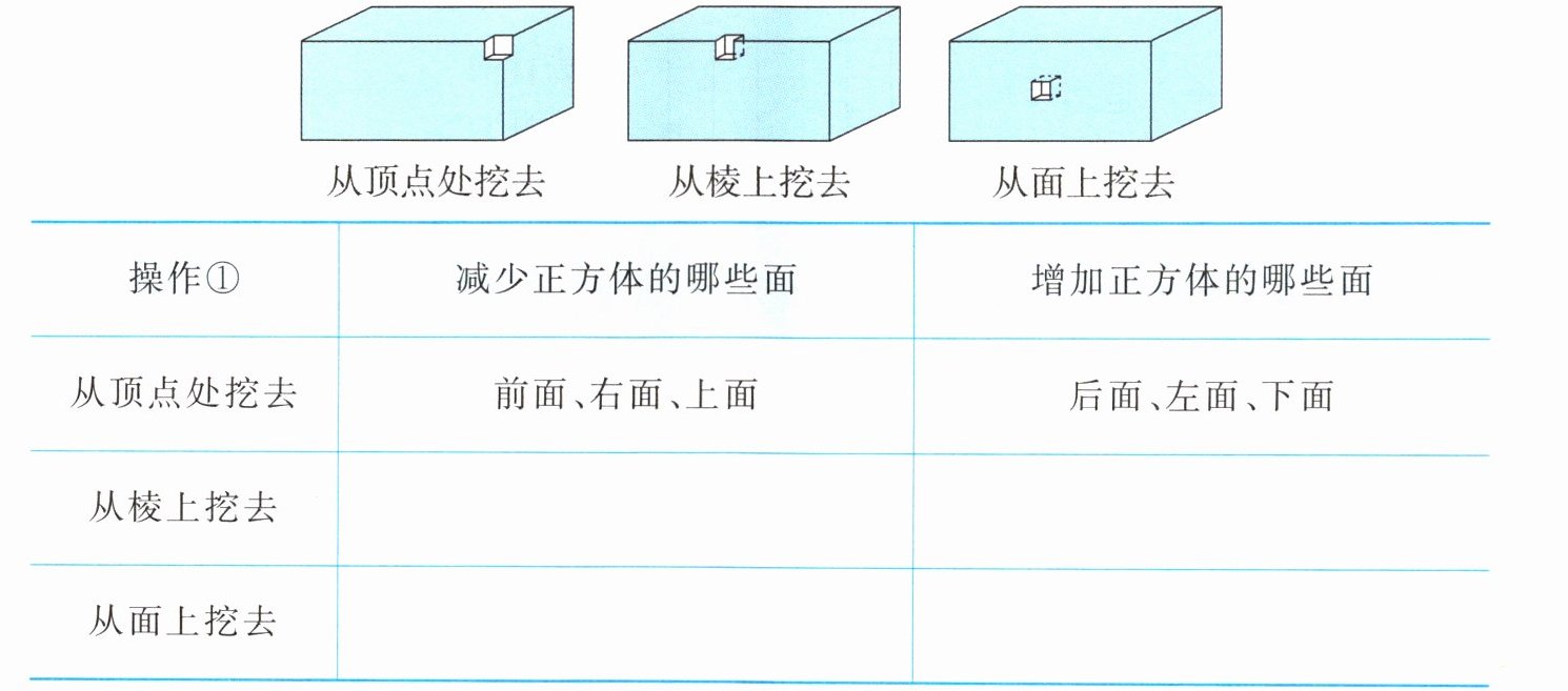 (2)从一个长10厘米、宽8厘米、高5厘米的长方体中挖去一个最大的正方体。先认真观察下图,再把表格补充完整。