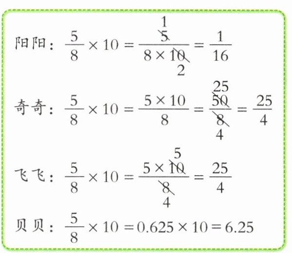 奇奇、飞飞、贝贝@@阳阳@@分数乘整数时,整数应与分数的分子相乘,不是和分母相乘@@示例:飞飞@@先约分再计算更简便