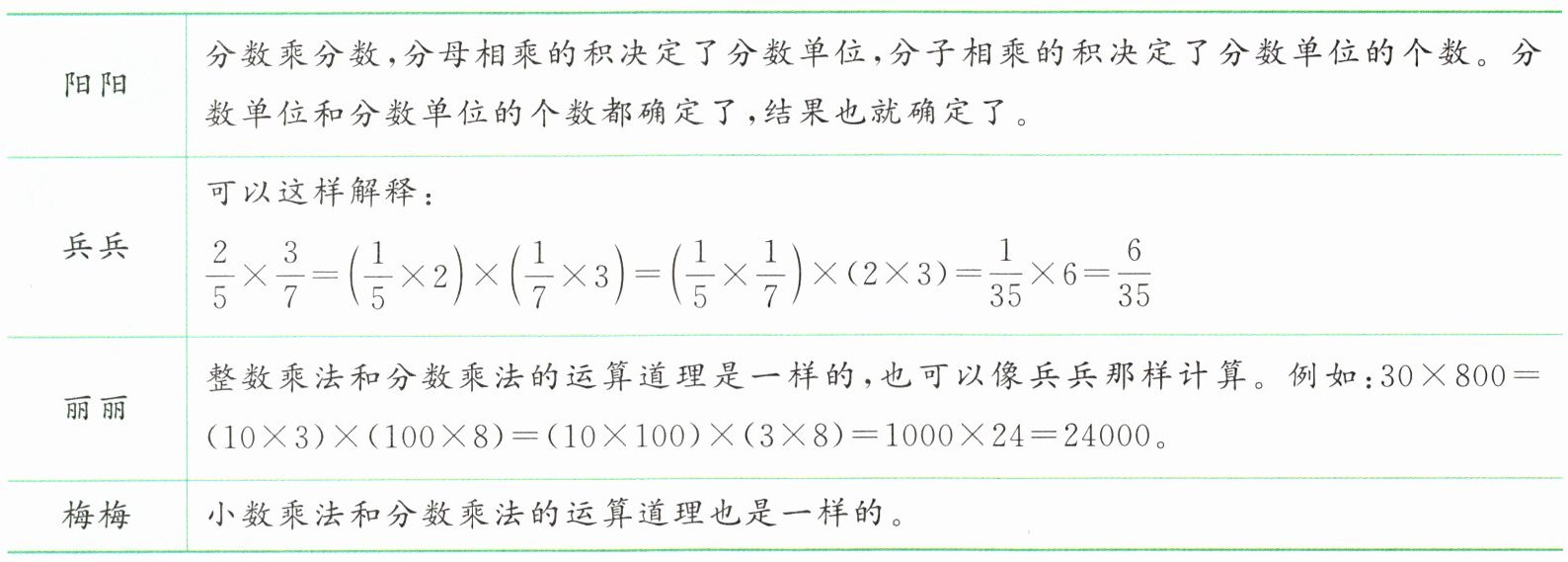 皮皮提出了一个问题:我看数学书上写着“分数乘分数,用分子相乘的积作分子,用分母相乘的积作分母”。按照这个方法计算就是$\frac{2}{5}\times\frac{3}{7}=\frac{2\times3}{5\times7}=\frac{6}{35}$,为什么可以这样计算呢?