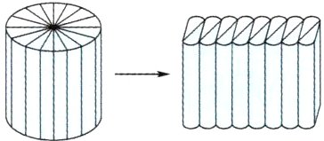 1. 如图,把一个底面半径是3厘米、高是5厘米的圆柱沿底面半径平均分成若干份,拼成一个近似的长方体,这个长方体的长是( )厘米,宽是( )厘米,高是( )厘米,体积是( )立方厘米,长方体的表面积比圆柱的表面积大( )平方厘米。