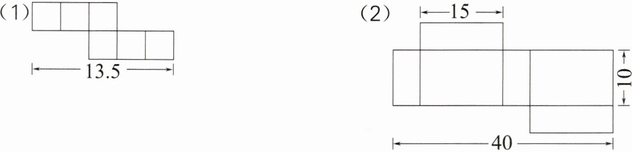 提升练(1)$13.5\div5 = 2.7$(厘米),$2.7\times2.7\times6 = 43.74$(平方厘米)@@(2)$40\div2 - 15 = 5$(厘米),$(15\times10 + 15\times5 + 10\times5)\times2 = 550$(平方厘米)