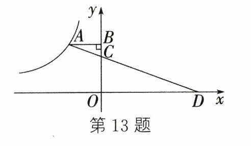 13. 如图,$A$是反比例函数$y = \frac{k}{x}(x<0)$图象上的一点,直线$AD$分别与$x$轴、$y$轴交于点$D$,$C$,$AB\perp y$轴于点$B$。若$\triangle ABC$与$\triangle DOC$相似,相似比为$\frac{1}{3}$,$\triangle ABC$的面积为$\frac{3}{4}$,则$k$的值为_______。
