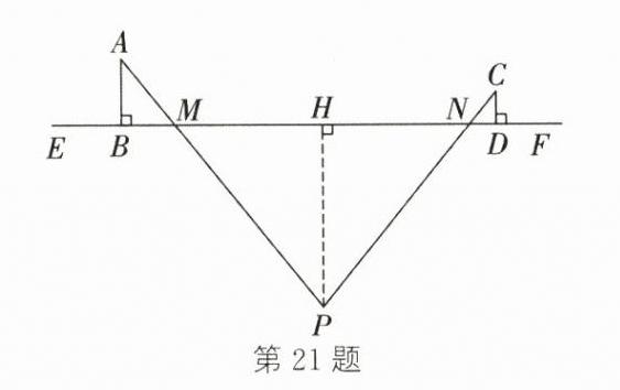 21.(6分)某小队在探险过程中发现了一个深坑,小队人员为了测出深坑的深度,采取如下方案:如图,在深坑左侧用观测仪$AB$从观测出发点$A$观测深坑底部的点$P$,且观测视线刚好经过深坑边缘的点$M$,在深坑右侧用观测仪$CD$从观测出发点$C$观测深坑底部的点$P$,且观测视线刚好经过深坑边缘的点$N$(点$E$,$B$,$M$,$N$,$D$,$F$在同一水平线上)。已知$AB\perp EM$,$CD\perp NF$,观测仪$AB$高2 m,观测仪$CD$高1 m,$BM = 1.6$ m,$DN = 0.8$ m,深坑的宽度$MN = 8.8$ m,请根据以上数据计算深坑的深度。