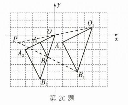 20.(6分)如图,在方格纸中,$\triangle OAB$的顶点坐标分别为$O(0,0)$,$A(-2,-1)$,$B(-1,-3)$,$\triangle O_{1}A_{1}B_{1}$与$\triangle OAB$是以点$P$为位似中心的位似图形。