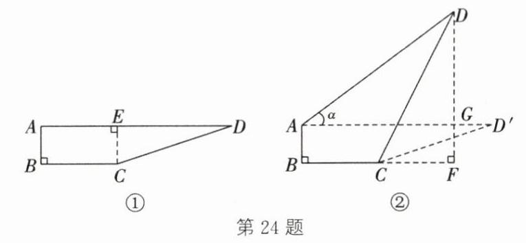(2) 如图②,过点$D$作$DF\perp BC$交$BC$的延长线于点$F$,交$AD'$于点$G$。易得四边形$ABFG$是矩形,$\therefore AB = FG = 10\ cm$,$AG = BF$,$\angle AGF = 90^{\circ}$,$\therefore\angle AGD = 90^{\circ}$。在$Rt\triangle ADG$中,$\tan\alpha=\frac{DG}{AG}=\frac{3}{4}$,$\therefore$设$DG = 3x\ cm$,则$AG = 4x\ cm$。$\therefore$在$Rt\triangle ADG$中,由勾股定理,得$AD=\sqrt{AG^{2}+DG^{2}}=\sqrt{(4x)^{2}+(3x)^{2}}=5x(cm)$。$\because AD = 50\ cm$,$\therefore 5x = 50$,解得$x = 10$,$\therefore AG = 40\ cm$,$DG = 30\ cm$,$\therefore DF = DG + FG = 30 + 10 = 40(cm)$,$BF = AG = 40\ cm$。$\because BC = 20\ cm$,$\therefore CF = BF - BC = 40 - 20 = 20(cm)$。在$Rt\triangle CFD$中,由勾股定理,得$CD=\sqrt{CF^{2}+DF^{2}}=\sqrt{20^{2}+40^{2}}=20\sqrt{5}(cm)$,$\therefore$此时可伸缩支撑杆$CD$的长度为$20\sqrt{5}cm$