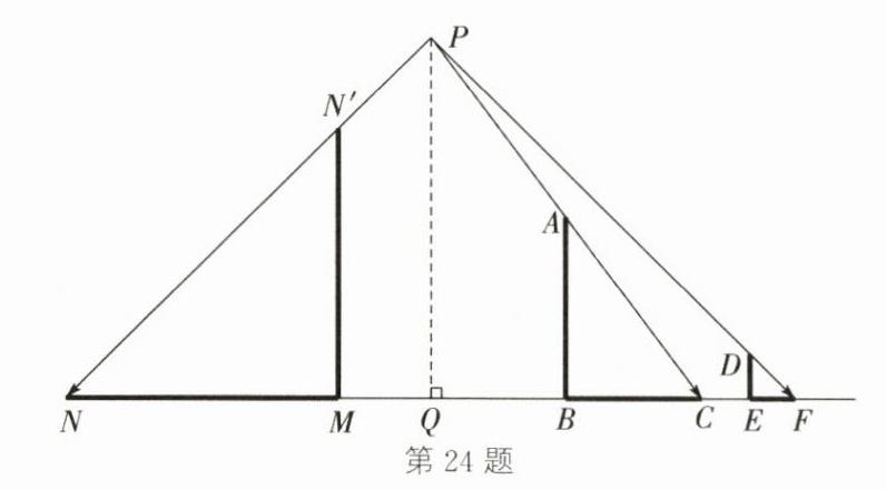 24.(10分)如图,路灯下一墙墩(用线段AB表示)的影子是BC,小明(用线段DE表示)的影子是EF,在点M处有一棵大树,它的影子是MN. 已知DE = 1 m,EF = 1 m,CE = 1 m,AB = 4 m,BC = 3 m,BM = 5 m,MN = 6 m.
