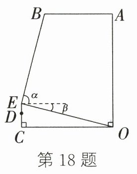 18. 如图所示为学生构建的跳台模型示意图,跳台立柱OA = 10 m,OA⊥地面OC,跳台AB = 6 m,AB//OC,裁判坐在垂直于地面的高架座椅CD上,座椅高CD = 1.2 m,眼睛与座位的竖直距离DE = 0.8 m,裁判望向起跳点B的仰角α与望向立柱底部点O的俯角β互余,则裁判与立柱之间的水平距离OC为_______m.