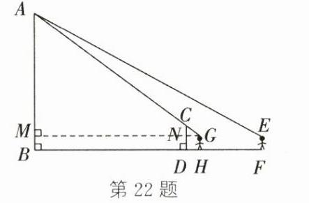 22. (10分)如图,某楼的高度AB = 18.2米,小华在距该楼30米(FB = 30米)的点F处,沿FB向点B前进,当走到点H处时,恰好看到广告牌CD的顶端C和楼顶A在一条直线上,小华的眼睛到地面的距离EF = GH = 1.7米,广告牌的高度CD = 3.2米,BD = 20米,点B,D,H,F在同一水平线上,AB⊥BF,CD⊥BF,GH⊥BF,EF⊥BF. 求小华从点F处向前走了多少米恰好看到点C和点A在一条直线上(即求HF的长).