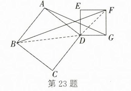(1)$=$ (2)$\because AB = AC$,$EC = ED$,$\angle BAC=\angle CED=\alpha$,$\therefore \angle ABC=\angle ACB=\angle ECD=\angle EDC=\frac{1}{2}(180^{\circ}-\alpha)$. $\therefore \triangle ABC\sim\triangle EDC$. $\therefore \frac{AC}{EC}=\frac{BC}{DC}$,即$\frac{AC}{BC}=\frac{EC}{DC}$. 又$\because \angle ACB+\angle BCE=\angle ECD+\angle BCE$,即$\angle ACE=\angle BCD$,$\therefore \triangle ACE\sim\triangle BCD$. $\therefore \frac{AE}{BD}=\frac{AC}{BC}=\frac{4}{5}$ (3)如图,连接$BD$,$DF$. $\because$四边形$ABCD$和四边形$DEFG$都是正方形,$\therefore AB = AD$,$\angle BAD = 90^{\circ}$,$DG = GF$,$\angle DGF = 90^{\circ}$. $\therefore \angle ADB=\angle ABD=\angle GDF=\angle GFD = 45^{\circ}$. 在$Rt\triangle BAD$中,由勾股定理,得$BD=\sqrt{AB^{2}+AD^{2}}=\sqrt{AD^{2}+AD^{2}}=\sqrt{2}AD$,$\therefore \frac{BD}{AD}=\sqrt{2}$. 同理,可得$\frac{DF}{DG}=\sqrt{2}$,$\therefore \frac{BD}{AD}=\frac{DF}{DG}$. $\because \angle ADB=\angle GDF$,$\therefore \angle ADB+\angle ADF=\angle GDF+\angle ADF$,即$\angle BDF=\angle ADG$. $\therefore \triangle BDF\sim\triangle ADG$. $\therefore \frac{BF}{AG}=\frac{BD}{AD}=\sqrt{2}$