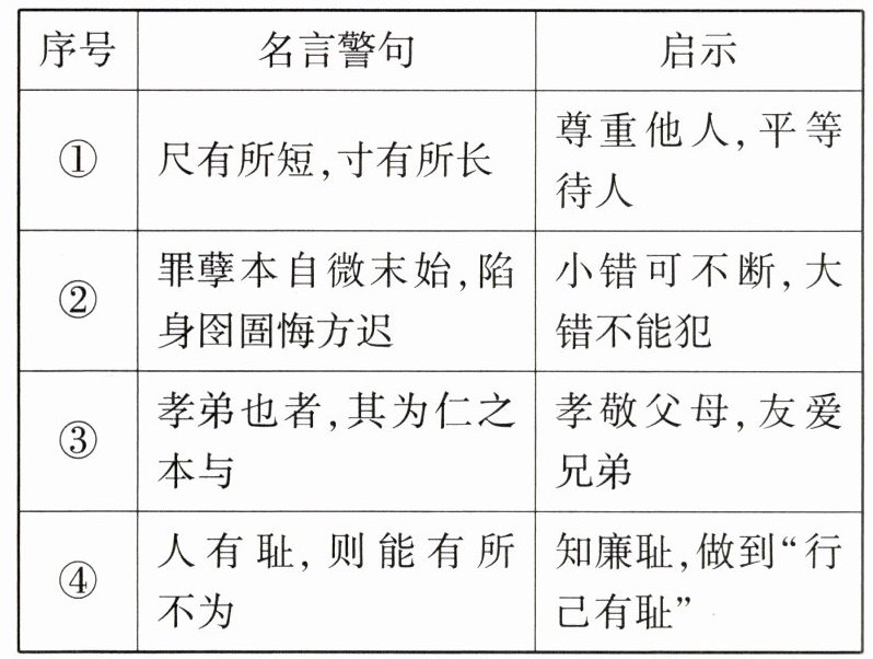 15.(2023山东济宁中考,6,★☆☆)一些名言警句寓意深远,经过岁月的沉淀,仍闪烁着时代的光芒,给我们留下了许多宝贵的启迪。下面表格中对应正确的是( )