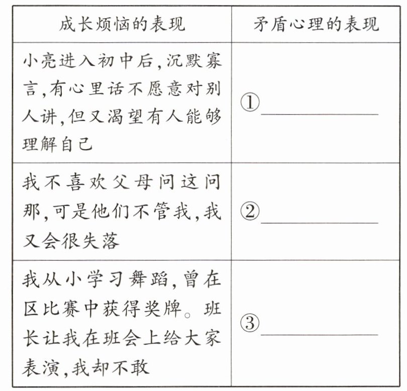 (2)问考查青春期矛盾心理产生的原因,学生依据教材知识回答即可。第
