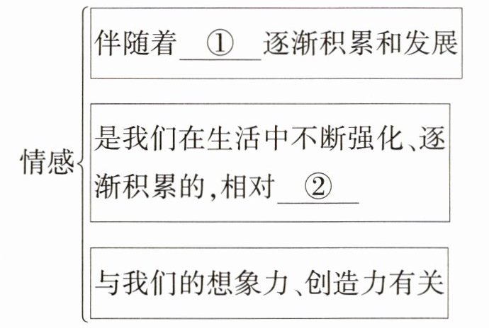 A 本题主要考查情感的相关知识。情感是伴随着情绪反应逐渐积累和发展的;情感是我们在生活中不断强化、逐渐积累的,相对稳定。A符合题意。
