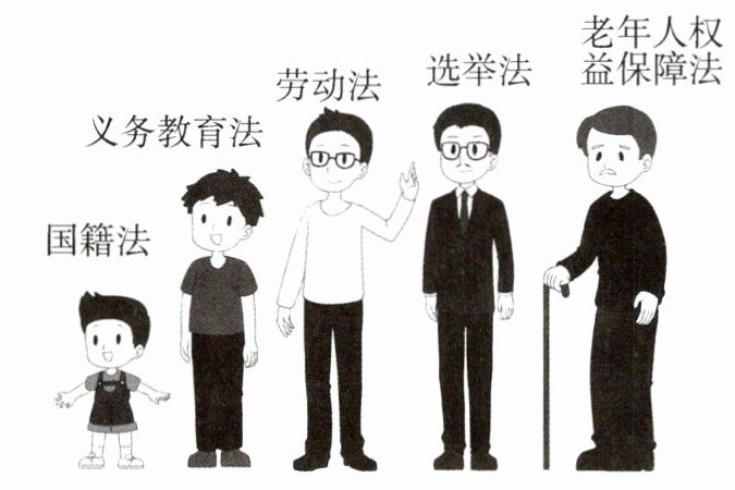 B 分析漫画可知,《我与法律》涉及法律与我们的关系,说明了法律与我们每个人相伴一生,B正确;A、D不符合题意,应排除;C错误,法律是调整社会关系的重要标尺,但不是唯一标尺。故选B。