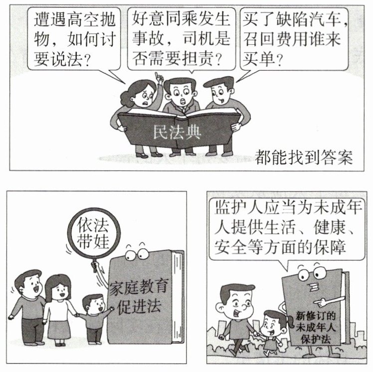 C 三幅漫画共同说明法律与我们的生活息息相关,C正确;法律靠国家强制力保证实施,A错误;宪法是个人的根本活动准则,B错误;违法行为要承担法律责任,只有犯罪行为才承担刑事责任,D错误。