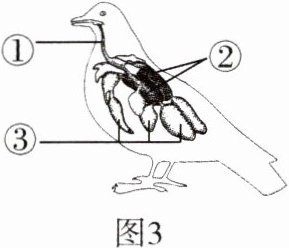 如图3鸟呼吸时,除肺外,还有许多与肺相通的[ ] ________ 辅助呼吸。