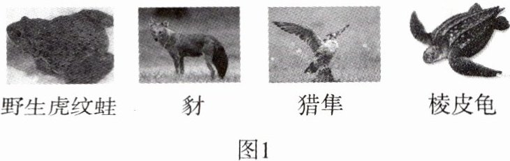 11.(滁州模拟,★★☆)2021版《国家重点保护野生动物名录》共列入野生动物980种和8类,其中国家一级保护野生动物234种和1类、国家二级保护野生动物746种和7类。如图1所示四种动物均在其中。(10分)